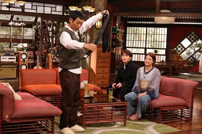 2人からのお土産として、実際に使用した黒帯を贈られると、さんまさんは「すごい…」と、さっそく胴に巻いて感触を確かめます。