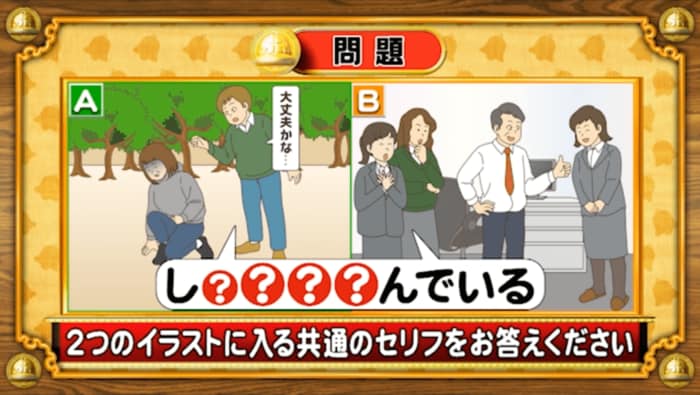 「し????んでいる」。2つのイラストに入る共通のセリフを答えてください。