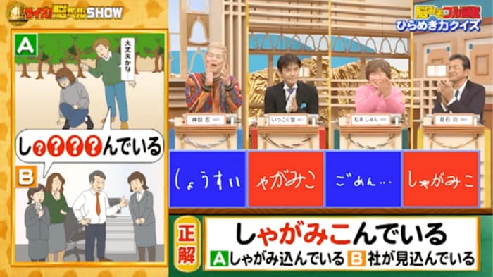 正解は、「しゃがみこんでいる(しゃがみ込んでいる/社が見込んでいる)」。