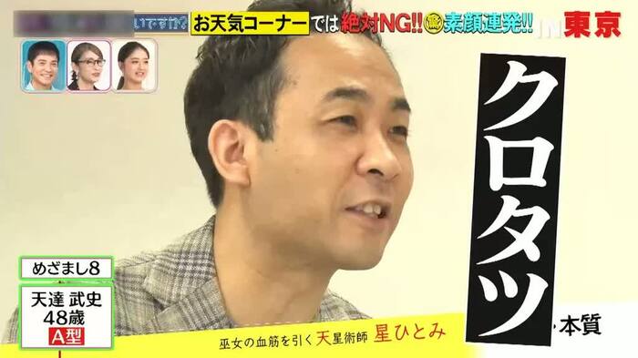 さらに、星さんが「本当はちょっとSっ気が入ってる。ちょっとだけ“腹黒い星”を持ってる」と占うと、天達さんは「親しいスタッフからは『クロタツ』とか呼ばれてる」と告白しました。