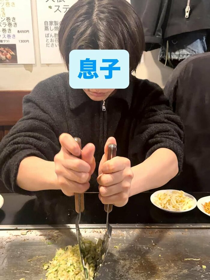 公開された写真には、両手にヘラを持ち、鉄板の上でもんじゃのタネを混ぜている長男の姿が。センターで分けられたヘアスタイルがとってもおしゃれで、どこか大人びた雰囲気が漂っています。