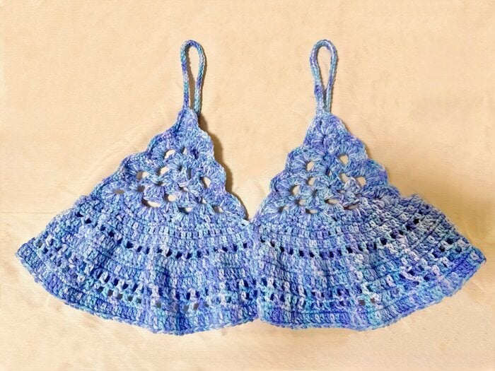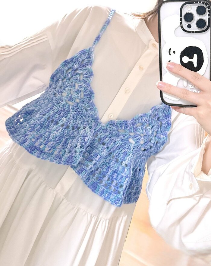 写真には、濃淡のある藍色が印象的なクロシェニットのトップスが写っており、花モチーフや透け感のある編み目がリズミカルに並ぶデザインに。裾はふんわりとフレア状に広がり、上部からは細いストラップが垂れ下がるなど、繊細な手仕事の魅力が感じられる仕上がりとなっています。思わず見入ってしまうほどの完成度の高さが目を引きます。