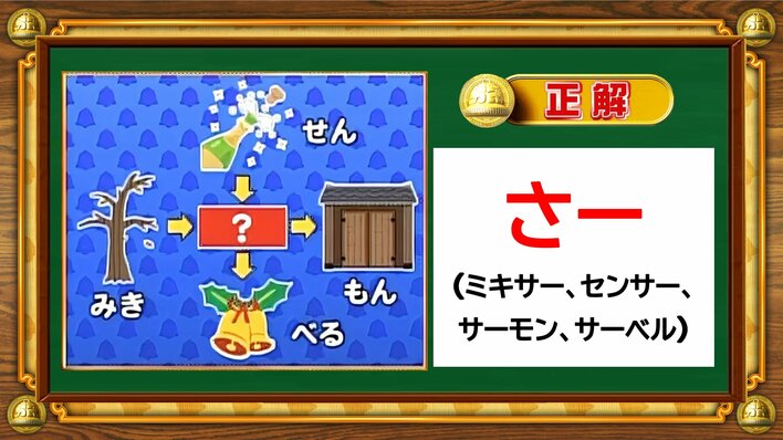 「みき[?]」「せん[?]」「[?]もん」「[?]べる」。4つのイラストに共通してくっつくワードは何でしょうか?