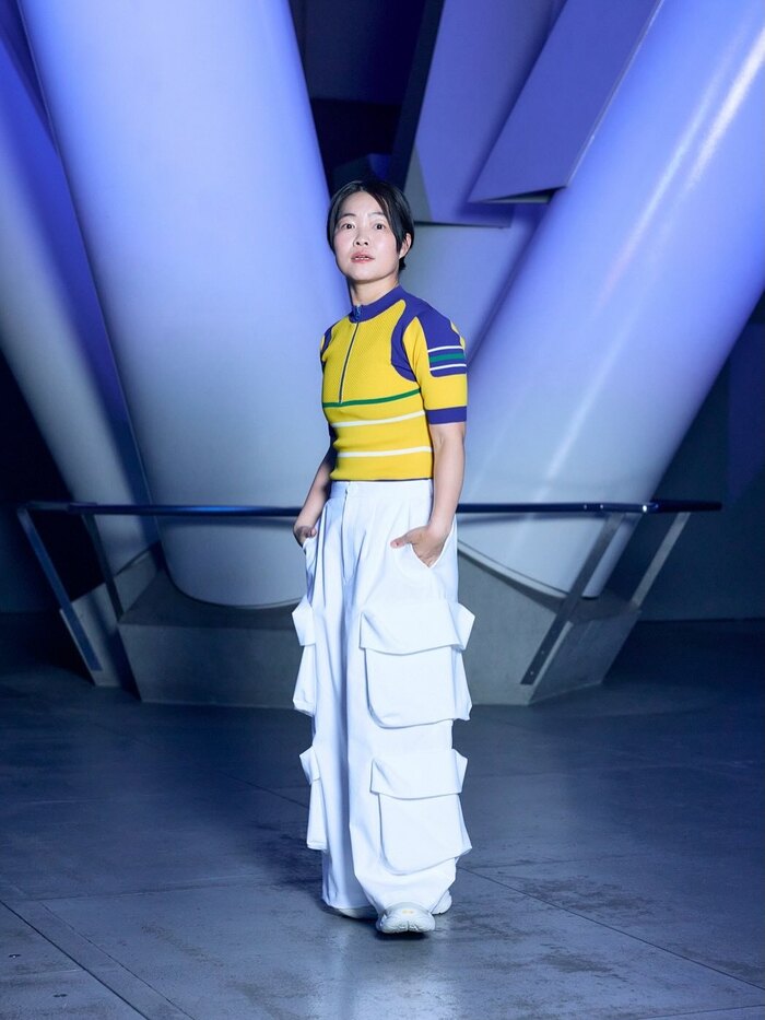 ボトムスには、フラップポケットが連なる立体的なシルエットの白いパンツを合わせ、アンニュイな空気感をまとった印象的な一枚となっています。大きな白い円柱と青い光の演出が、スタイリッシュな雰囲気をさらに引き立てています。