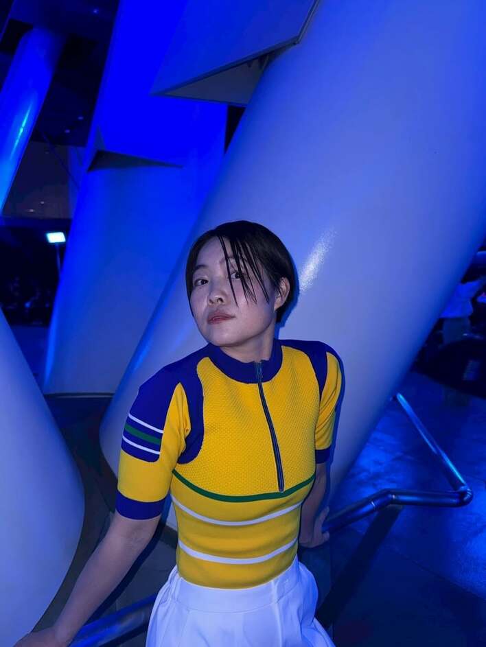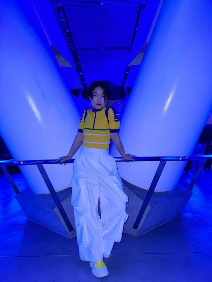 黄色と藍色のメッシュ素材のトップスは胸元のジップがアクセントになっており、洗練されたメイクアップが肌のつやも際立たせています。