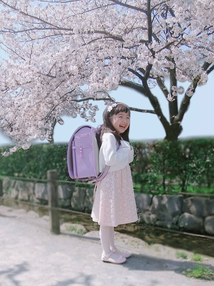咲き誇る桜の木の下で、紫のパステルカラーがかわいらしいランドセルを背負った増田さん。