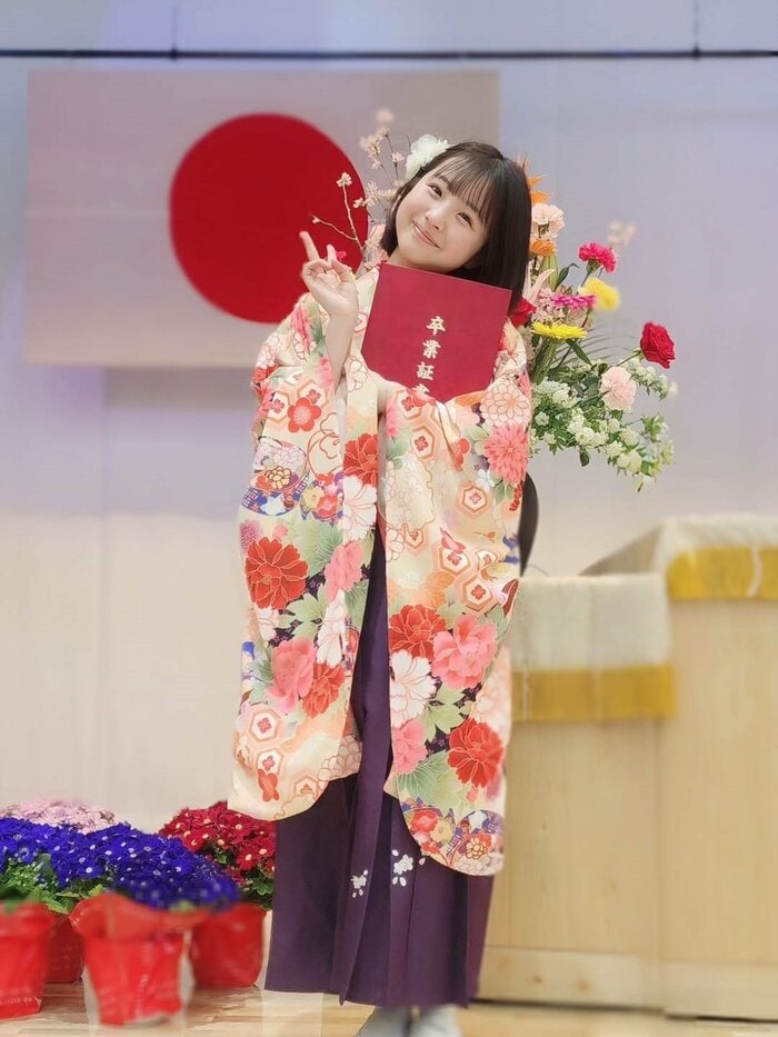 壇上に立ち、腕の中でえんじ色の「卒業証書」を抱えながら晴れやかな袴姿を披露。
