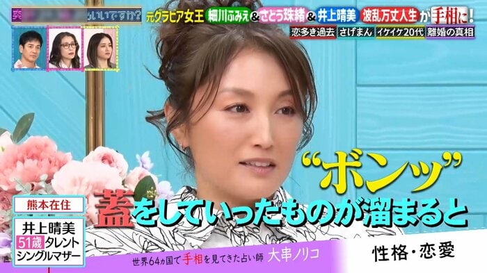 大串さんは、井上さんが離婚した理由について「家庭に対する責任感が強いから、全部自分でやってしまって、男性の居場所がなくなる。話し合わなきゃいけない問題にフタをしてしまう」と鑑定。
