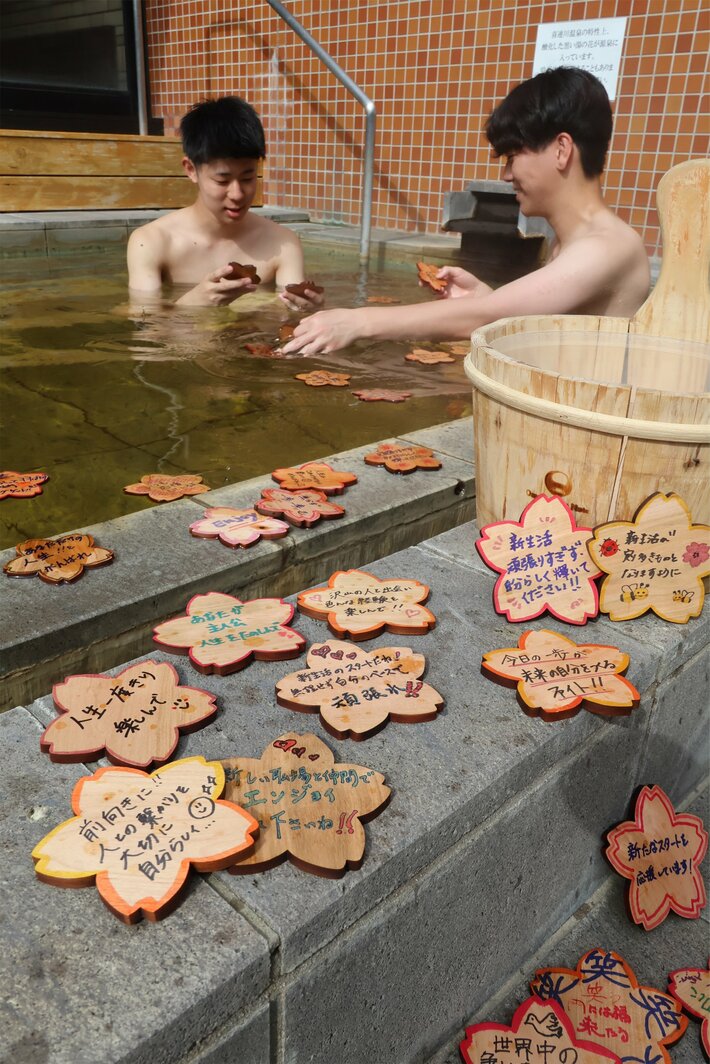 桜風呂では、桜の形にカットした100枚の入浴木にスタッフが新生活を迎える方々へのメッセージを書き込み、湯船に浮かべます。