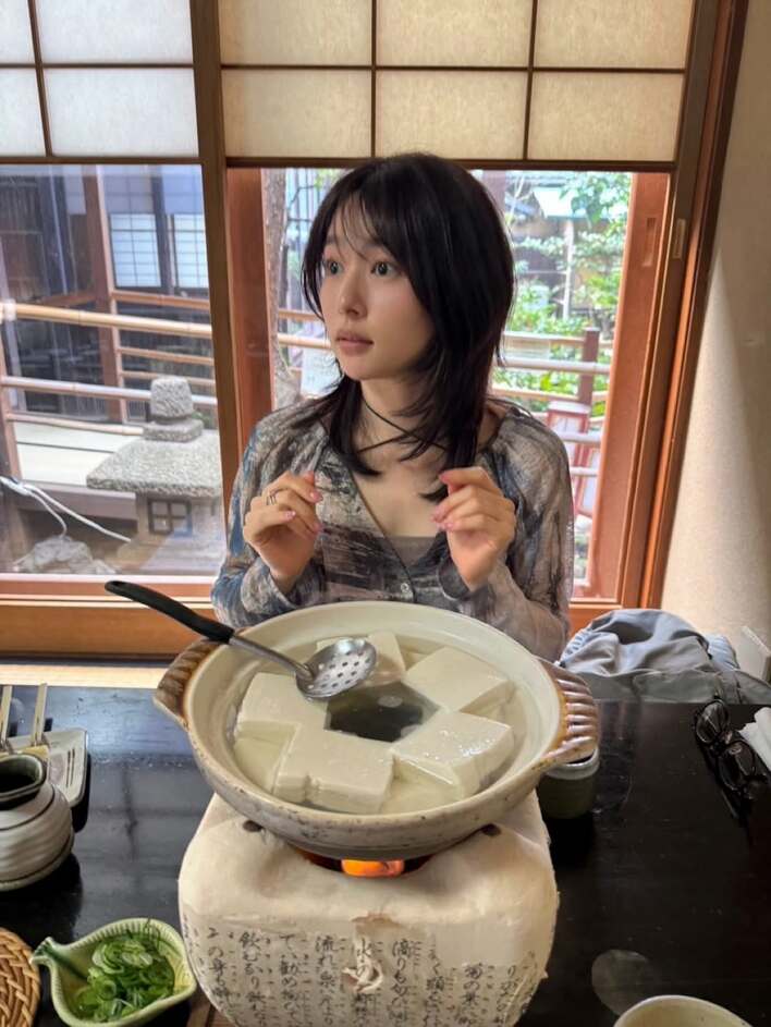 公開された写真には、湯豆腐が入った大きな鍋の前に座る桜井さんの姿が。桜井さんは、心が弾んでいるようなウキウキとした表情で周囲を見つめていて、楽しげな雰囲気が伝わってきます。