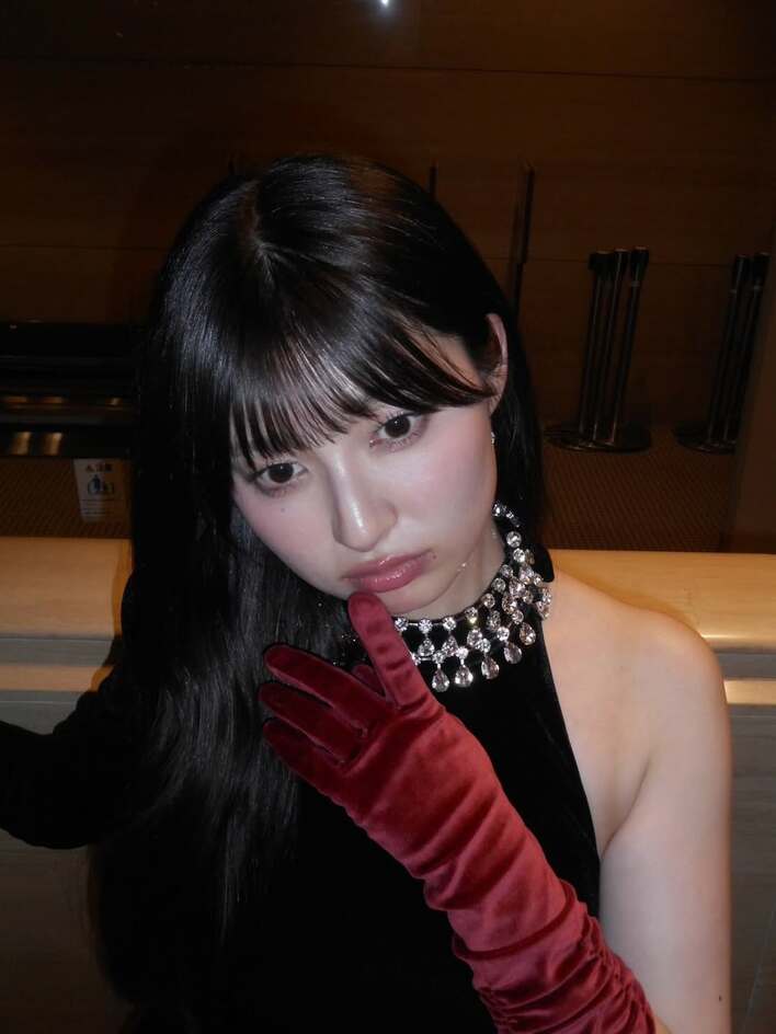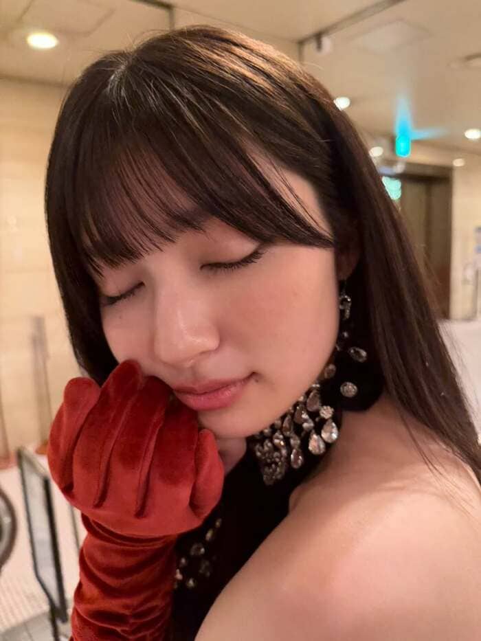 写真を見てみると、首元のビジューが豪華な黒いドレスにボルドーのグローブをつけて、ポーズを決める吉川さんの姿が。