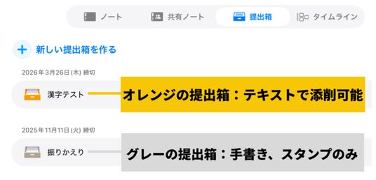 テキストでの添削は、最新バージョンで作成された提出箱でご利用いただけます。テキスト添削に対応している提出箱は、オレンジ色で表示されます。