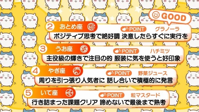 『めざましテレビ』で放送中の「ちいかわ占い」 テレビ放送がない日はお休みで、月~土:朝7時以降に更新予定です。