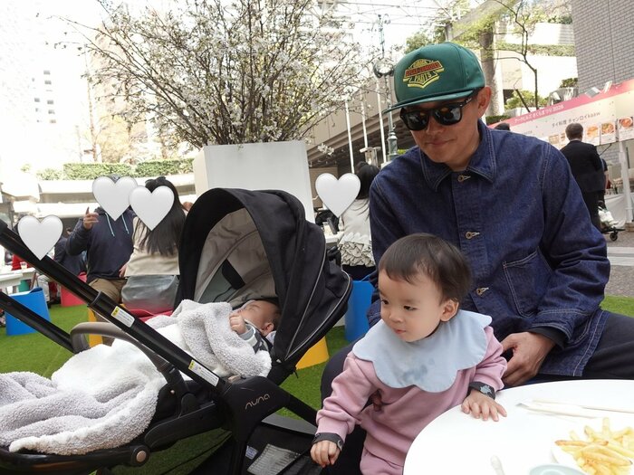 ピンクカラーの服に淡い青色のよだれかけを付けた“兄バーグ”は、何かに興味津々の様子。一方の“チビバーグ”は、ベビーカーの中で気持ちよさそうにスヤスヤと眠っているようです。