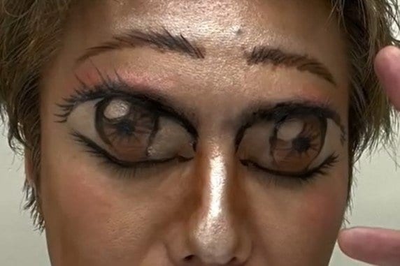 眉毛は本来の位置を飛び越えておでこにくっきり描かれていて、1本1本の毛が丁寧に書かれていることで、まるで本物の眉毛のようです。