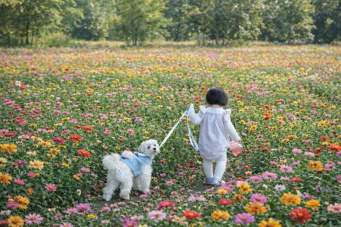 そこには、黄色や赤色といったカラフルなお花畑が遠くの方まで広がる、なんともメルヘンチックな空間で愛犬を散歩させるお子さんの姿が!