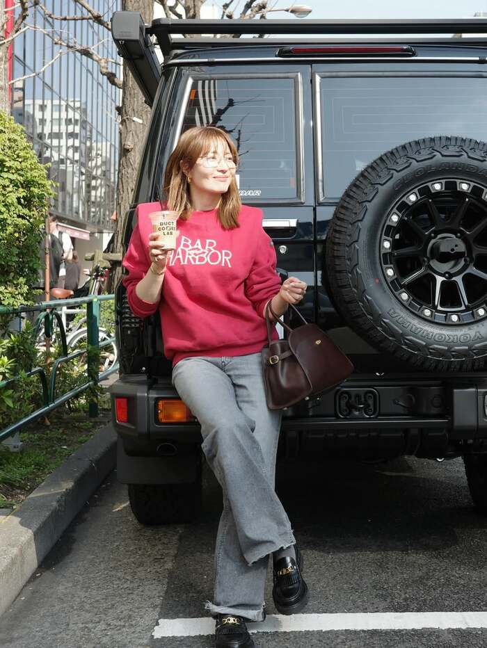 公開された写真には、迫力満点な愛車 ランドクルーザーの後方ステップに軽く腰をかけ、足を組んでリラックスした新山さんの姿が収められています。新山さんは赤いトレーナーにデニムを合わせたカジュアルなスタイルで、ドリンク片手に遠くを見つめ、柔らかな笑みを浮かべています。
