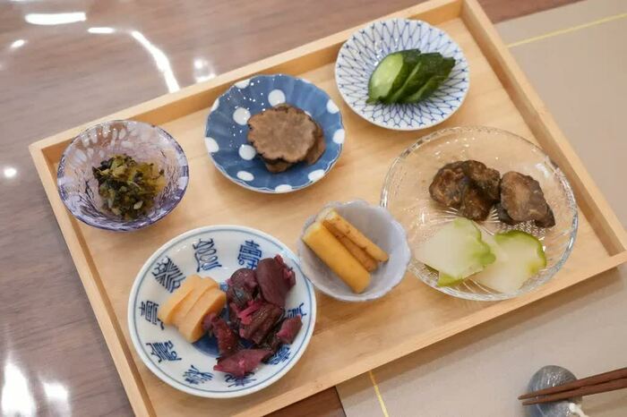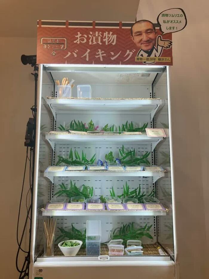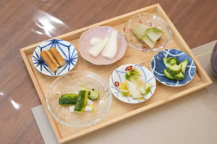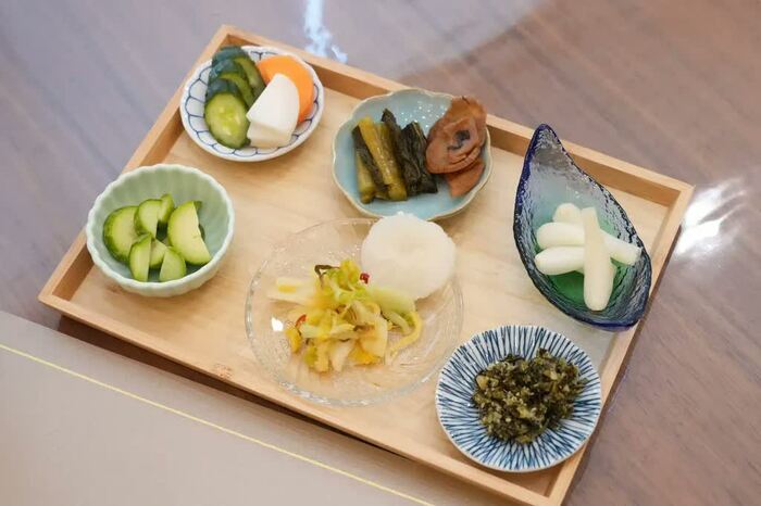 3人は、完成したお互いのだしを仲良く味見。そして、漬物専門店「やなぎに桜」の漬物ソムリエオススメの“お漬物バイキング”から、だし茶漬けに合う漬物をセレクトしていきました。