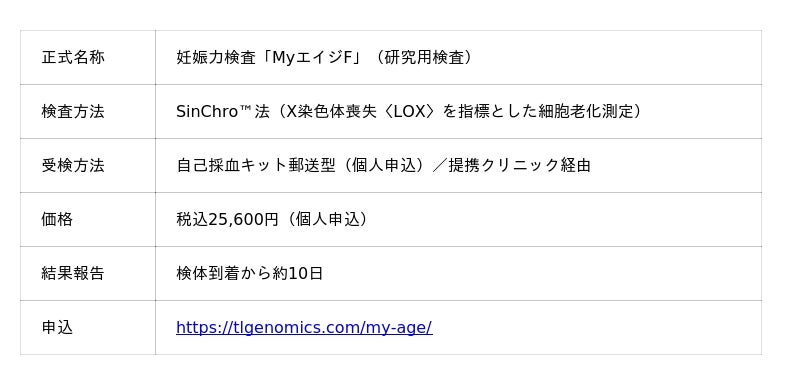 妊娠力検査「MyエイジF」(研究用検査)は、血液中のX染色体の変化を指標に細胞老化を測定し、自然妊娠のポテンシャルを可視化します。自宅で自己採血・郵送するだけで受検でき(税込25,600円)、結果は約10日で届きます。