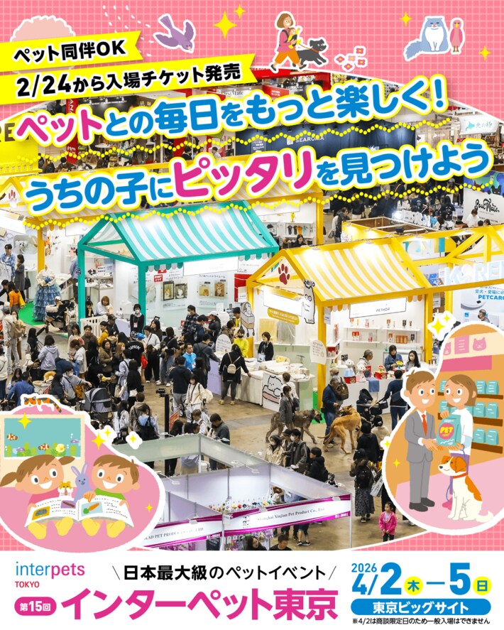「第15回インターペット東京」とは、約60,000人の参加者を見込むペットと人の暮らしを豊かにするペット産業国際見本市です。人とペットの豊かな暮らしを推進する企業が一堂に集結し、最新技術やサービス、フードの比較検討、商談ができる場になっています。