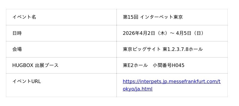 犬・猫用ローフードの製造・販売を行う株式会社ハグオール(本社:滋賀県大津市北小松344、代表取締役:梶谷 江世)は、2026年4月2日(木)から5日(日)まで東京ビックサイト開催される第15回インターペット東京 日本最大級のペット産業国際見本市に2年連続出展いたします。