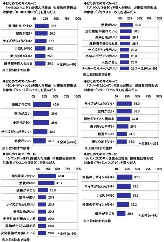 ◆はじめてのマイカーを選んだ理由 1位「価格が手ごろ」2位「サイズがちょうどいい」3位「外装のデザインがいい」 「N-BOX」では「乗り降りしやすい」、「プリウス」では「燃費がいい」が最多