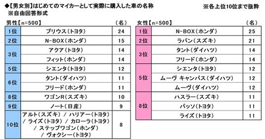 ◆はじめてのマイカーに選んだ車 1位「N-BOX」2位「プリウス」3位「タント」「フリード」 男性回答1位「プリウス」、女性回答1位「N-BOX」