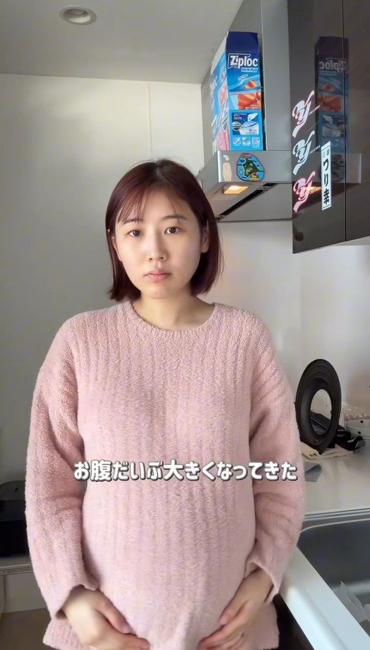 横からのショットでは、さらにその大きさが一目瞭然!ふわふわのニットの上からも、まん丸なお腹が見て取れる程に。