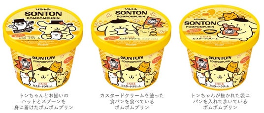 コラボパッケージは全部で3パターンのデザインを展開いたします。ソントンのマスコット「トンちゃん」とお揃いのハットとスプーンを身に着けたポムポムプリンがデザインされているほか、チームプリンのおともだちがファミリーカップを持っている姿などが、かわいらしく描かれております。ぜひ手に取ってお楽しみください。