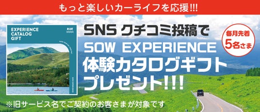 - 内 容: 旧サービス名(SOMPOで乗ーる)でご契約中のお客さまを対象に、SNSでの クチコミ投稿をいただいた中から、抽選で5名さまに「SOW EXPERIENCE 体験 カタログギフト」をプレゼント。