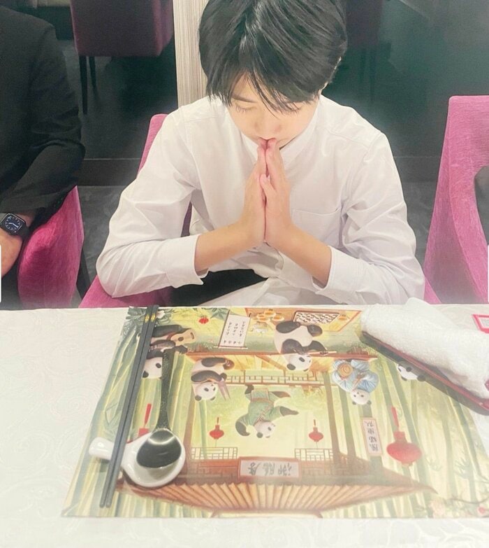 さらに、そんな食事を前に手を合わせる新之助さんの姿も公開。清潔感のある白いシャツに身を包み、胸の前で両手を合わせて静かに顔を伏せる様子からは、食事に向き合う真摯で落ち着いた姿勢が伝わってきます。黒髪が凛とした印象を引き立て、思わず目を引く一枚となっています。