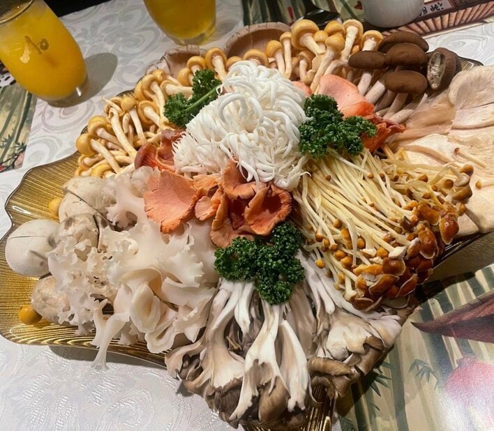「きのこ達」とつづって投稿された写真には、白いテーブルクロスが敷かれた食卓いっぱいに、舞茸や茶えのき、なめこといった定番のきのこから、見慣れない色や形のものまでがずらりと並び、まるできのこ尽くしの一皿のような光景が広がっています。思わず“きのこ鍋でも始まるのでは?”と想像してしまうほどのボリュームです。