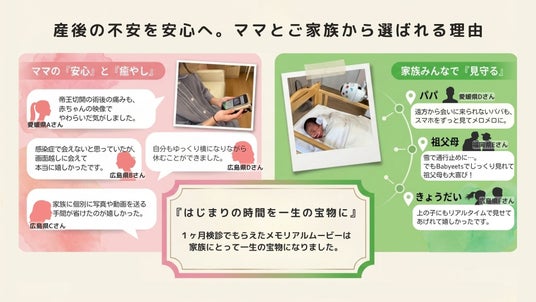 リアルタイム配信:家族みんなで、スマートフォンやPC から同時に視聴可能。高いセキュリティ:医療機関での使用を前提とした厳格な基準で映像データを安全に保存・配信。