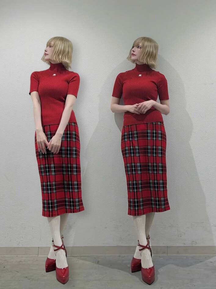 また、当日のファッションについて「真っ赤なお洋服にしてみました!」とつづり、全身ショットを披露。高い襟の赤いニットは体にフィットしており、美しいスタイルのラインがくっきりと際立っています。チェック柄のロングスカートに、赤いハイヒールと白いソックスを合わせたコーディネートは、金色の髪とも相性抜群。「クレージュのニットお気に入りで色違い3色持ってる笑」と、お気に入りぶりものぞかせました。