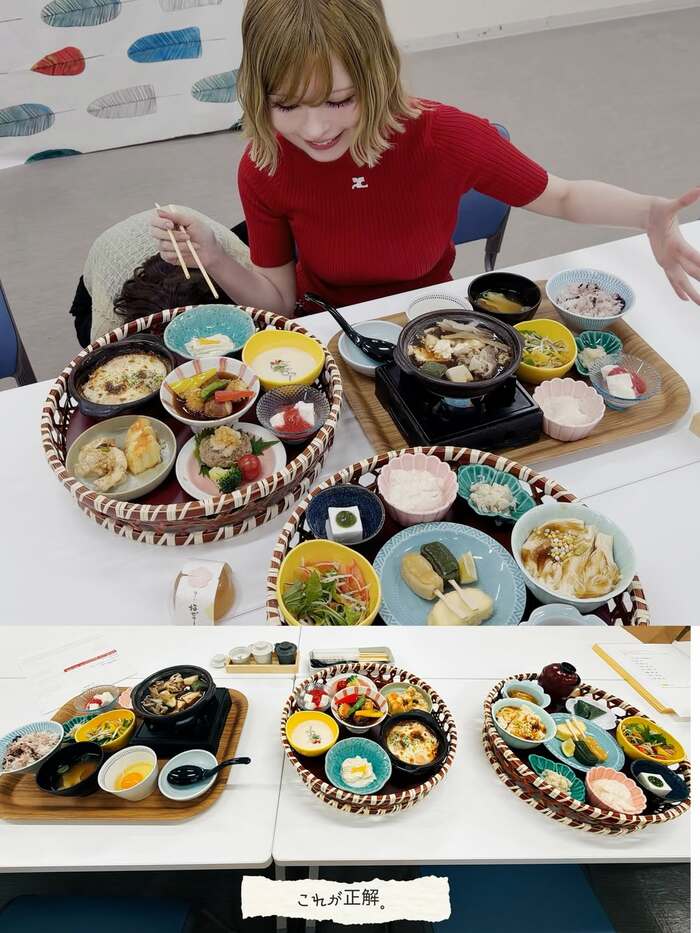 さらに、イベントの合間に楽しんだ食事の様子も公開。白いテーブルの上には大きな籠盛りが並び、青や黄、緑、ピンクといった色とりどりの小鉢がぎっしり。魚介や野菜、豆腐、揚げ物、煮物など、丁寧に盛り付けられた和食が食欲をそそります。箸を手にした益若さんの表情からは、思わず食事に心が弾んでいる様子が伝わってきます。