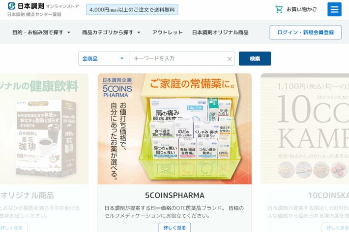 サイト内の検索機能にAIを搭載し、検索アルゴリズムやサジェスト機能を最適化。検索スピードの向上と安定性を実現し、ストレスのない商品探しをサポートします。あわせて、日本調剤のプライベートブランドである、原則550円(税込)均一※2のOTC医薬品(市販薬)シリーズ「5COINS PHARMA」と、1,100円均一のOTC漢方薬シリーズ「10COINSKAMPO」の専用ページを新設。お悩み別のイラストやチャートに沿って進むだけで、ご自身の症状や体質・体調に合ったお薬を直感的にお選びいただけます。