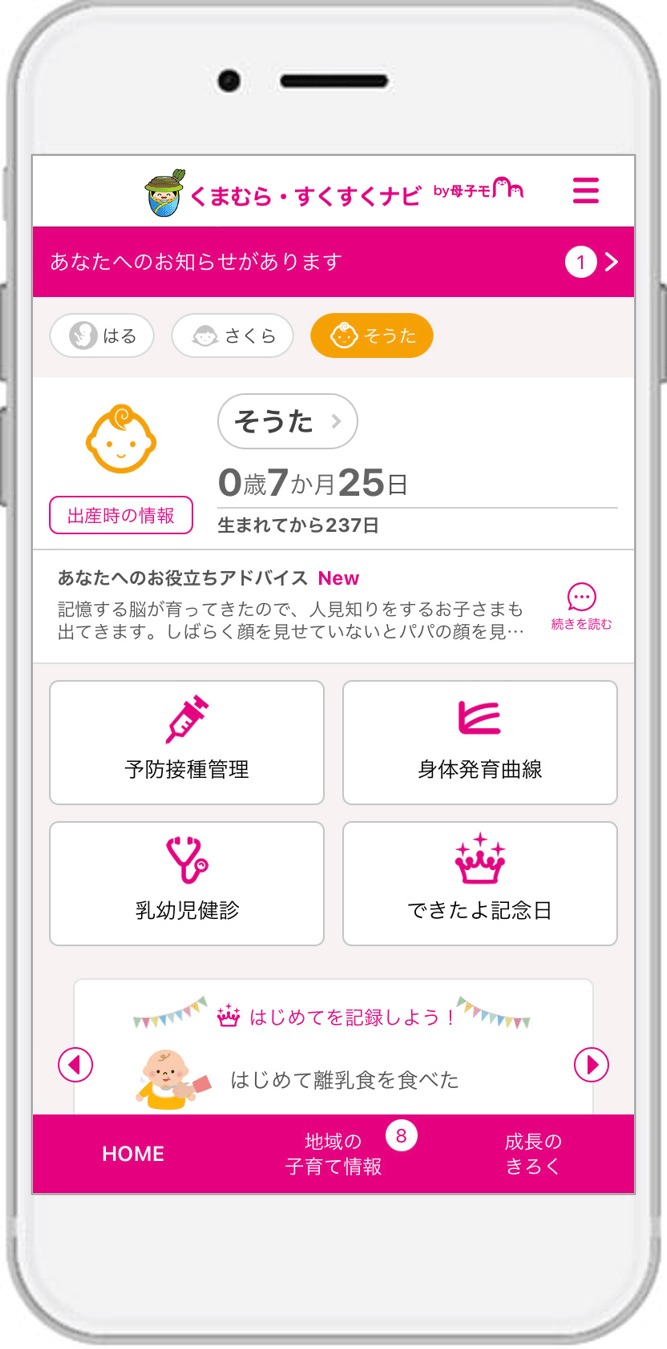 球磨村に採用された『くまむら・すくすくナビ』は、スマートフォン・タブレット端末・PCに対応したサービスで、妊産婦と子どもの健康データの記録・管理や予防接種のスケジュール管理、出産・育児に関するアドバイスの提供、離れた地域に住む祖父母など家族との共有機能や、村が配信する地域の情報をお知らせするなど、育児や仕事に忙しい母親や父親を助けてくれる便利な機能が充実しています。