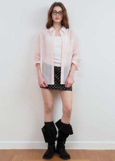 ストライプ シャツ/ショップ名: 【公式】 rolarola Japan控えめなストライプ柄とライトピンクのシアー素材がトレンドライクな一枚。ドットのミニスカートに折り返しニーハイブーツを合わせた甘辛コーデ。
