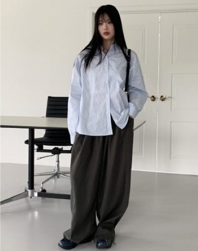 WONDERWONDER ストライプ シャツ/ショップ名:wonderwonder綿100%の通気性に優れたオーバーシルエット。爽やかなブルーのストライプシャツに、バレルレッグパンツを合わせてこなれ感をプラス。