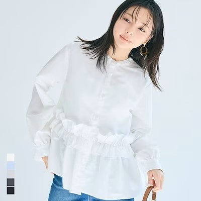 【2位】coca ホイップフリルブラウス/ショップ名:coca今季トレンドのフリルと、体型カバーも叶うペプラムシルエットが魅力の一枚。程よいツヤとハリのあるブロード素材で高見え効果も。