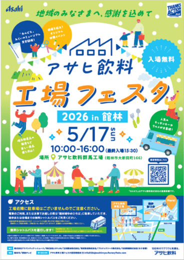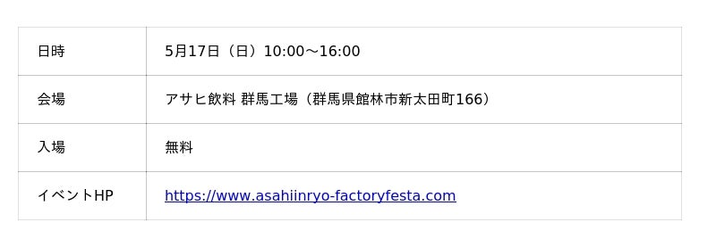 アサヒ飲料株式会社(本社 東京、社長 近藤佳代子)は5月17日、群馬工場で「アサヒ飲料 工場フェスタ」を開催します。