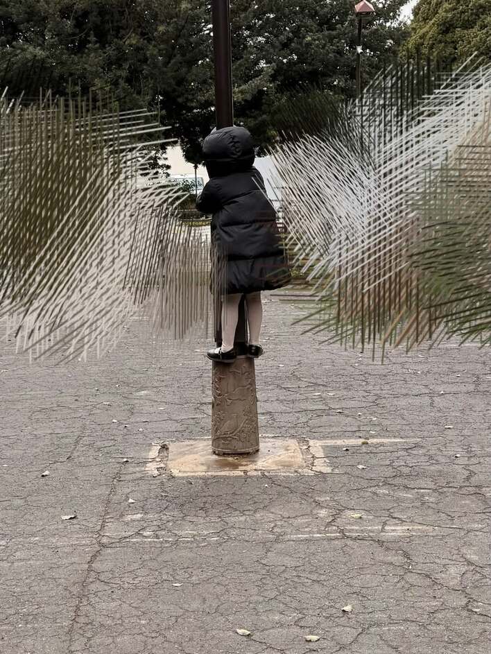 拡大された2枚目を見てみると、黒いジャンパー姿の次女がポールの根元部分にがっしりとしがみついています!わずかな段差に懸命に足をかけている姿が何ともキュート!