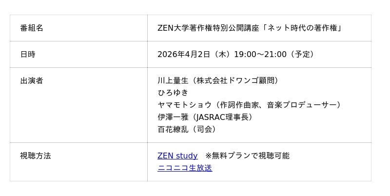 また、本講座の開講に先だち、4月2日に、誰でも無料で視聴できる公開講座「ネット時代の著作権」のライブ配信も行われます。