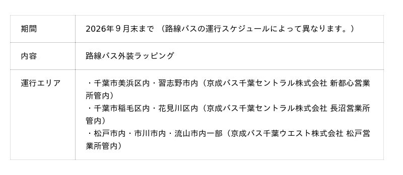 「ちばコーギーバス」は、当行およびちばコーギー、ちば興銀カードローンの認知向上を目的として、現在3路線(項目3参照)で運行しておりますが、今回新たに「ジャンボくん」の外装ラッピングを施した「ちばコーギーバス」が船橋市・鎌ヶ谷市内を走行いたします。千葉ジェッツふなばしとのコラボレーションは本エリア限定となりますので、ぜひご注目ください。なお、現在走行しております3台の「ちばコーギーバス」の運行は当初2026年3月末までとしておりましたが、好評につき、2026年9月末まで運行期間を延長いたしました。