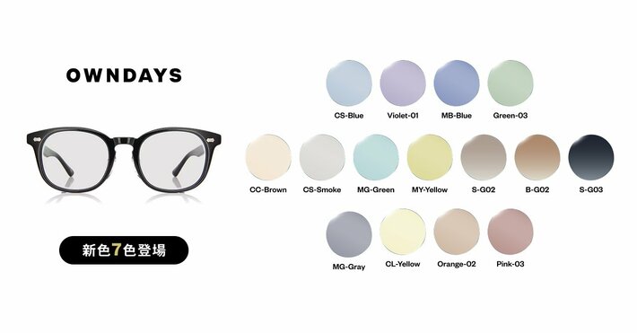 OWNDAYSでは今回、新たにCC-Brown、MY-Yellow、MG-Green、CS-Smoke、S-G02、B-G02、S-G03の7色を追加し、カラーレンズのラインアップを拡充しました。視界を快適にサポートする機能的なカラーから、コーディネートのアクセントとなるカラーまで幅広く取り揃え、ライフスタイルやファッションに応じた選択が可能です。