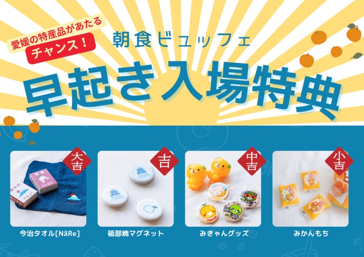 本キャンペーンでは、朝活の一環として、早朝6時30分までにご入場のうえ朝食をご利用いただいたお客様を対象に、ハズレなしのガチャガチャをお楽しみいただける専用コインを、1名様につき1枚お渡しするサービスを開始いたしました。なお、朝食を無料でご利用のお子様は対象外となります。愛媛の特産品が当たるワクワク感をお楽しみいただけます。