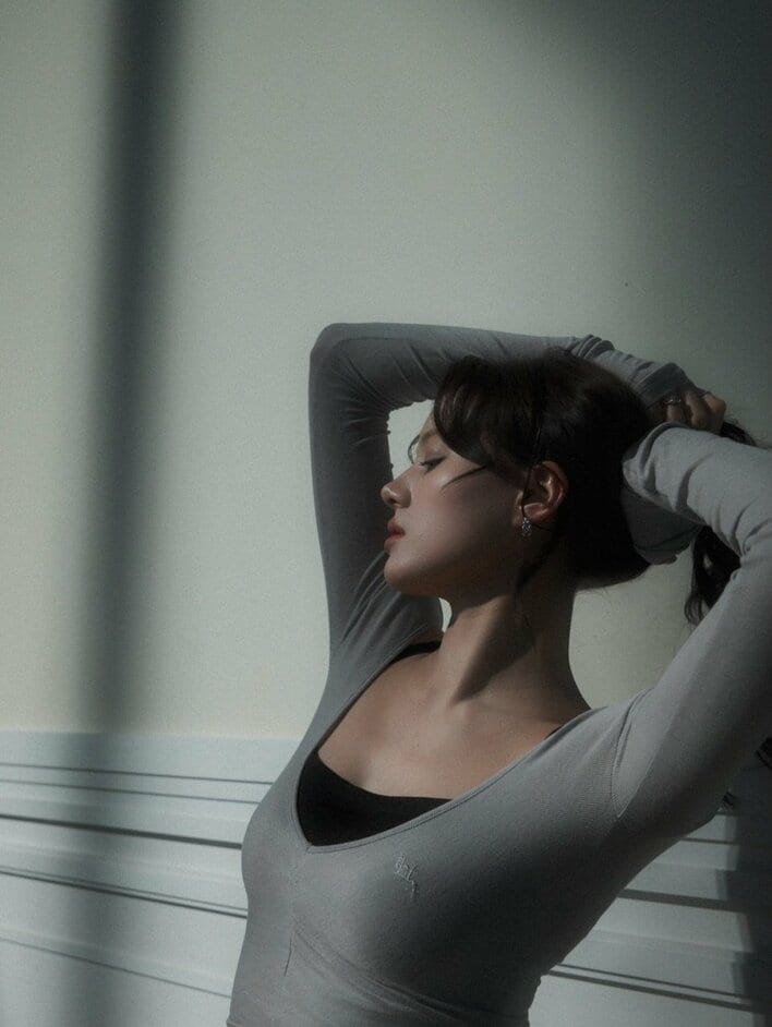 ロングヘアを頭の後ろで束ねるようなポーズのショットは、美しいデコルテや首筋のラインに思わず目を奪われますね。