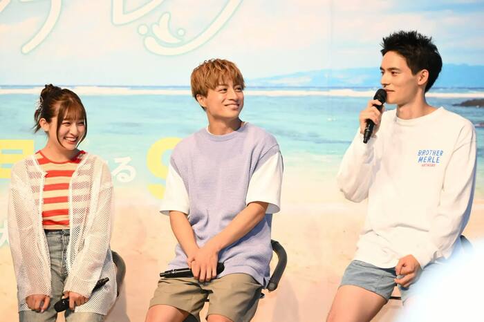 海辺が似合わない役柄を演じる男性陣には「焼けちゃダメ」とプロデューサーから指示が出ているそうで、がっつり日傘を差している間宮さんと白濱さんのクランクイン時の様子が投影されると、白濱さんが持っている日傘が萩原さんにまったくかかっていないことに気付き、「もうちょっと利久に日傘をかけてあげればよかった」と、白濱さんが笑う一幕も。
