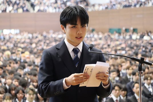 新入生総代の芥川玄成さん(医学部医学科)は、「歴史と伝統ある福岡大学で学べることは、大きな喜びであると同時に、大学生としての責任を感じ身の引き締まる思いがしています。AIの発展や国際社会が抱えるさまざまな課題を前に、私たちは社会の一員として何ができるのかを考え続け、学びを社会に生かしていきたいと考えています。これからの大学生活では、困難や失敗も経験するかもしれませんが、仲間と共に学び合い、主体的に挑戦を重ねながら成長し、福岡大学で得た学びを社会に役立てられるよう努めてまいります」と入学の辞を述べました。