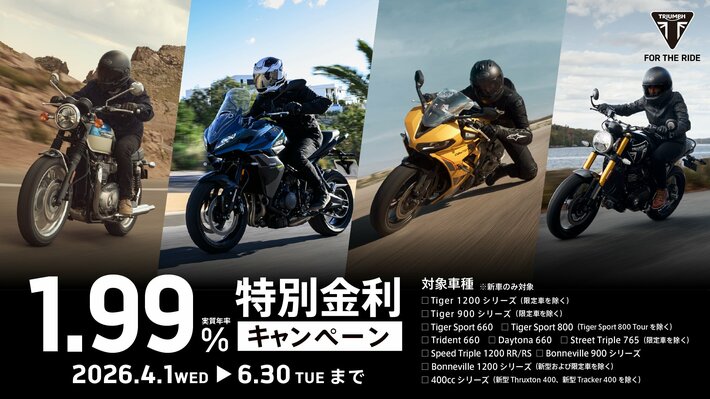 トライアンフモーターサイクルズジャパン株式会社(本社:東京都港区海岸 代表取締役社長:大貫陽介)は4月1日(水)~6月30日(火)までの期間中、全国のトライアンフ正規販売店にて「1.99%特別金利キャンペーン」を開催することをお伝えします。